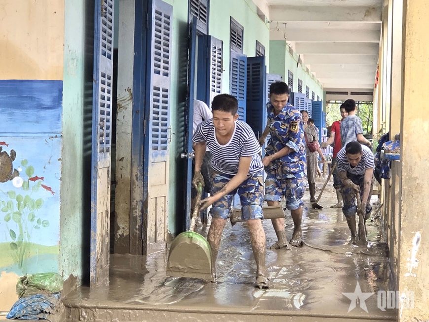 Nhiều điểm trường bị ngập sâu, bùn non đóng dày 20-30cm đã được cán bộ, chiến sĩ Lữ đoàn 957 phối hợp cùng cán bộ, giáo viên, học sinh và đoàn thể địa phương thu gom, san gạt, xịt rửa sạch sẽ.