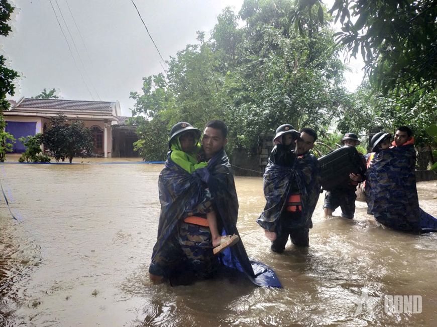 | Cán bộ, chiến sĩ Lữ đoàn 957 giúp nhân dân di dời người và tài sản đến nơi an toàn. |