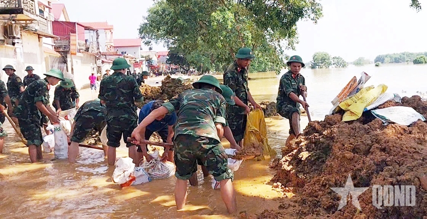 Bộ đội Lữ đoàn công binh 229 đắp đê chống tràn tại xã Hợp Thịnh. |