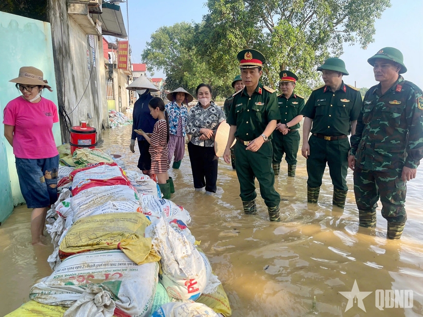 Thiếu tướng Trần Trung Hòa, Tư lệnh Binh chủng Công binh chỉ đạo trực tiếp Lữ đoàn công binh 229 giúp địa phương đắp đê, chống tràn tại xã Hợp Thịnh.