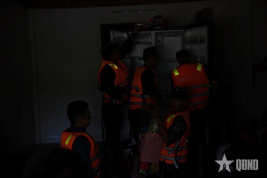 Giữa màn đêm đặc quánh, những ánh đèn pin nhỏ bé trước trán người chiến sĩ trở thành điểm tựa cho dân. Dưới sự dẫn đường của lực lượng dân quân, họ gõ cửa từng nhà, cẩn thận dìu người già, trẻ nhỏ lên thuyền. Khi dân đã an toàn, bộ đội quay trở lại giúp di chuyển đồ đạc, phương tiện. Từ những vật dụng đơn giản đến tài sản có giá trị như tủ lạnh, ti vi đều được các chiến sĩ nâng niu, vận chuyển đến nơi khô ráo.