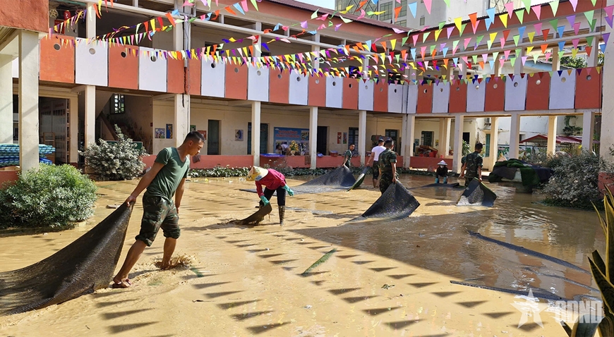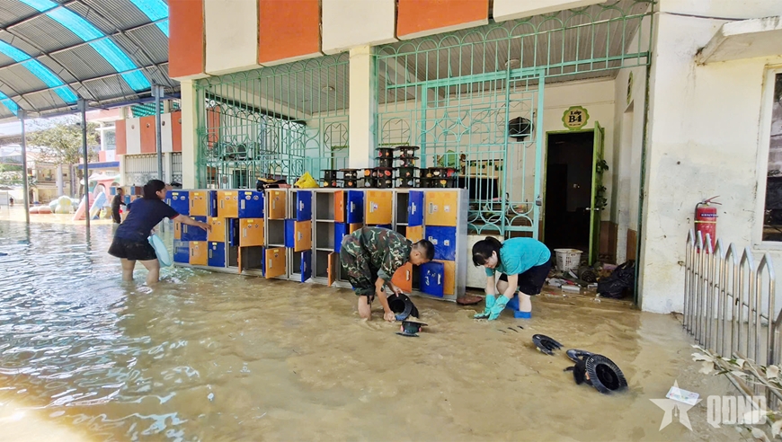 Cán bộ, chiến sĩ Lữ đoàn Pháo binh 382 (Quân khu 1) hỗ trợ dọn dẹp, khắc phục hậu quả mưa lũ trên địa bàn.