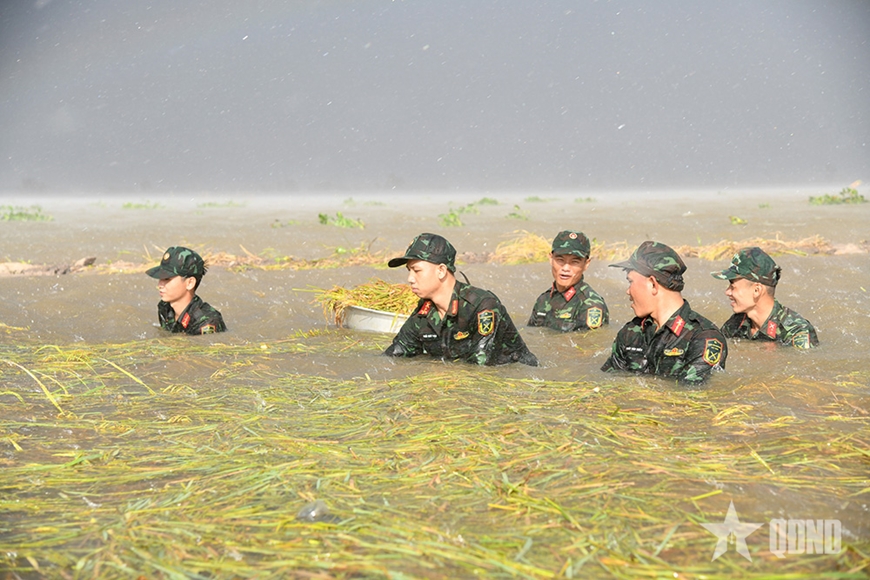 Cùng hòa mình vào dòng nước, cán bộ, chiến sĩ Đại đội 9, Ban chỉ huy Phòng thủ khu vực 4-Tân Thạnh (Bộ CHQS tỉnh Tây Ninh) nhanh chóng dàn hàng dưới nước dùng liềm cắt từng bó lúa nhỏ. Những mảnh bạt ni lông được các chiến sĩ kết thành thuyền nổi trên mặt nước để đựng lúa. Dù khó nhọc, phải trần mình dưới nước nhưng các chiến sĩ vẫn cười tươi, cùng nhau cố gắng giúp bà con vơi bớt nỗi đau mất mùa. Trách nhiệm và nghĩa tình, các chiến sĩ đã phần nào lan tỏa hơi ấm thân thương tới người nông dân.