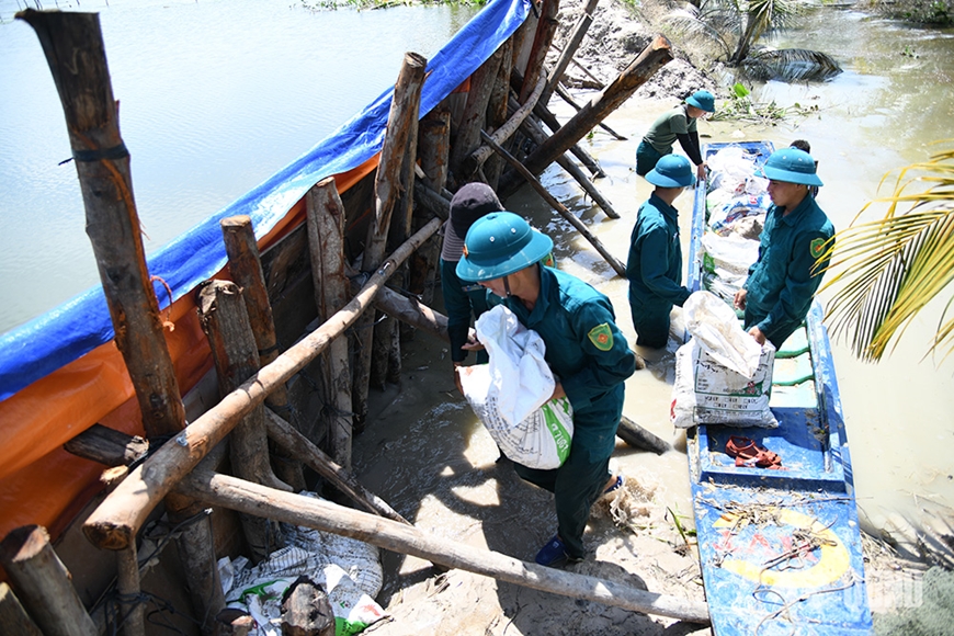 | Dân quân xã Tân Hưng (tỉnh Tây Ninh) khắc phục sự cố đê bao bị vỡ. |
