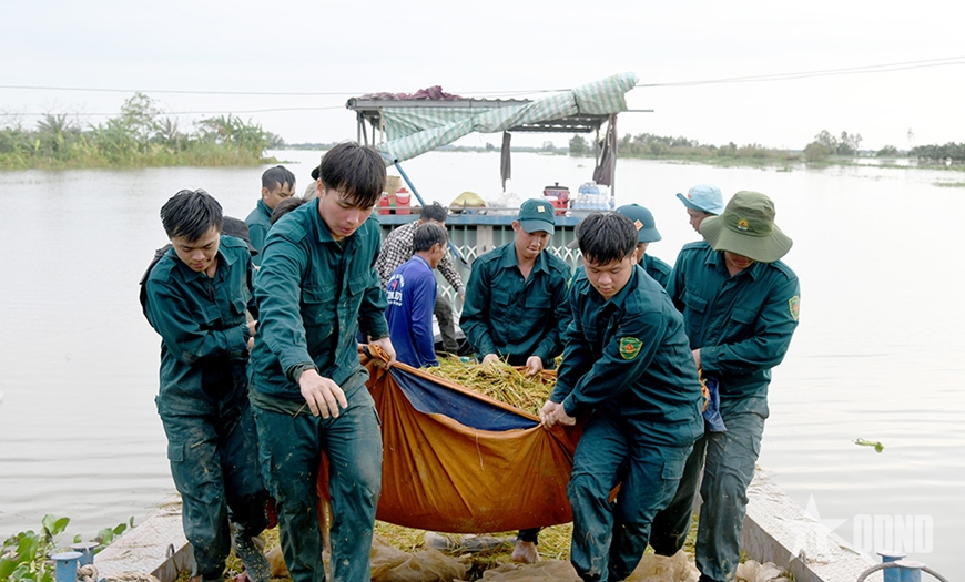 Đồng chí Phạm Sĩ Bel, chiến sĩ dân quân thường trực Ban CHQS xã Tân Hưng, tỉnh Tây Ninh, cho biết: “Chống lũ không có tính thời gian nữa, vì người dân cần gấp nên chúng tôi làm chừng nào xong mới về. Làm phụ được bà con bao nhiêu thì hay bấy nhiêu”...
