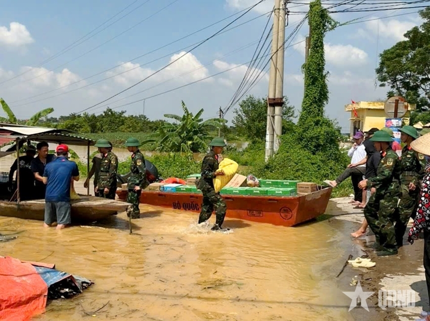 Bộ đội giúp đỡ người dân thôn Diên Lộc, xã Tam Giang (Bắc Ninh) ứng cứu tài sản, vận chuyển lương thực ra khỏi vùng ngập lụt. Ảnh: qdnd.vn |