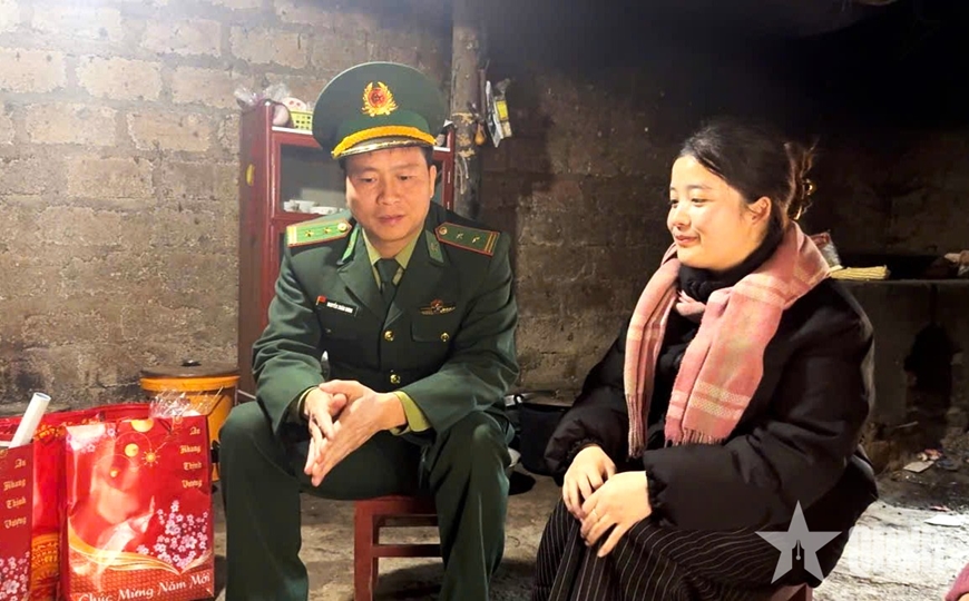 | Trung tá Nguyễn Xuân Hưng, Chính trị viên Đồn Biên phòng Lũng Cú, thăm hỏi, động viên và dặn dò con nuôi của đơn vị trước thềm năm mới. |