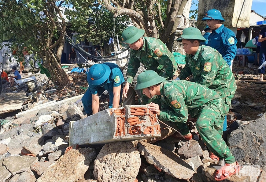 | Cán bộ, chiến sĩ Bộ đội Biên phòng tỉnh Quảng Ngãi giúp nhân dân khắc phục hậu quả thiên tai. |
