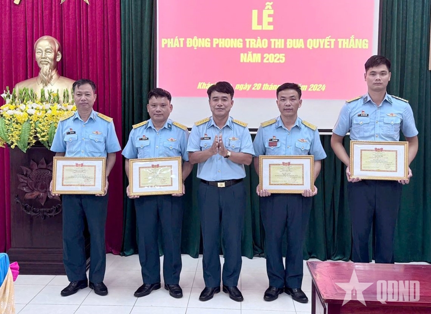 Đại úy Đào Công Luận (ngoài cùng, bên phải) nhận danh hiệu Chiến sĩ thi đua cơ sở năm 2024. |
