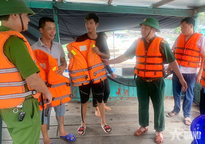 | Đại tá Nguyễn Tiến Vinh (thứ 2 từ phải sang) cùng các lực lượng tuyên truyền, vận động người dân trên lồng bè nuôi thủy hải sản về khu vực tránh trú bão an toàn trước cơn bão số 9-Ragasa năm 2025. |