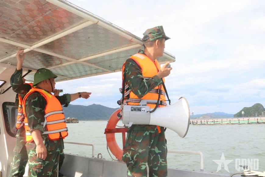 | Đại tá Nguyễn Tiến Vinh, Chỉ huy trưởng Ban Chỉ huy Phòng thủ khu vực 3-Đặc khu Vân Đồn (người chỉ tay), cùng cán bộ, chiến sĩ đơn vị kêu gọi tàu thuyền về nơi tránh trú bão an toàn. |