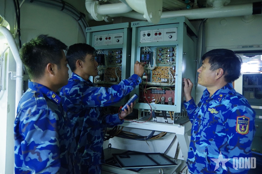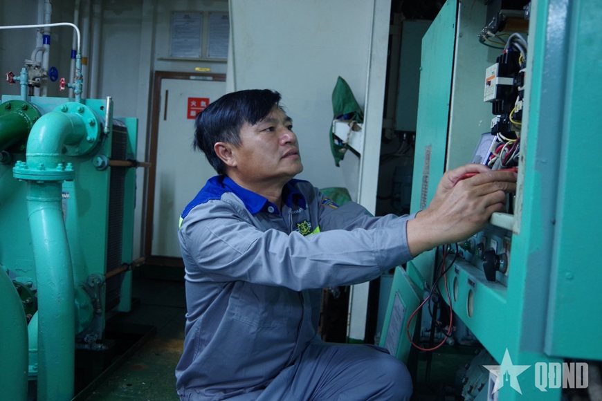 Trung tá QNCN Nguyễn Duy Nhân, Điện trưởng Tàu CSB 6001 kiểm tra các thiết bị điện.