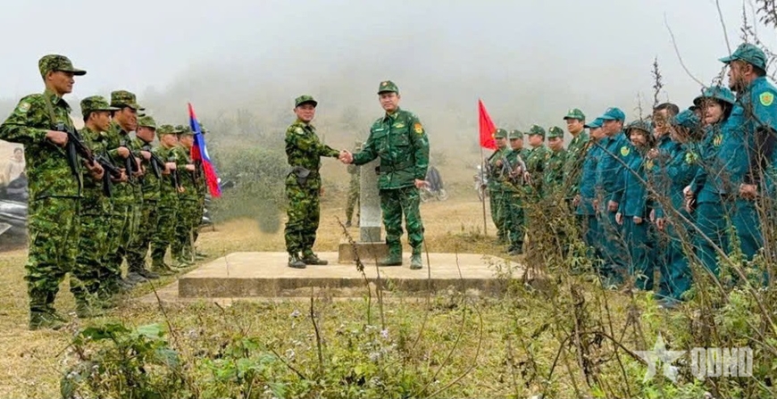 | Thiếu tá Cầm Bá Thành (đứng bên phải) cùng với đồng đội phối hợp với lực lượng bảo vệ biên giới của tỉnh Huaphanh (Lào) tuần tra song phương bảo vệ biên giới. |