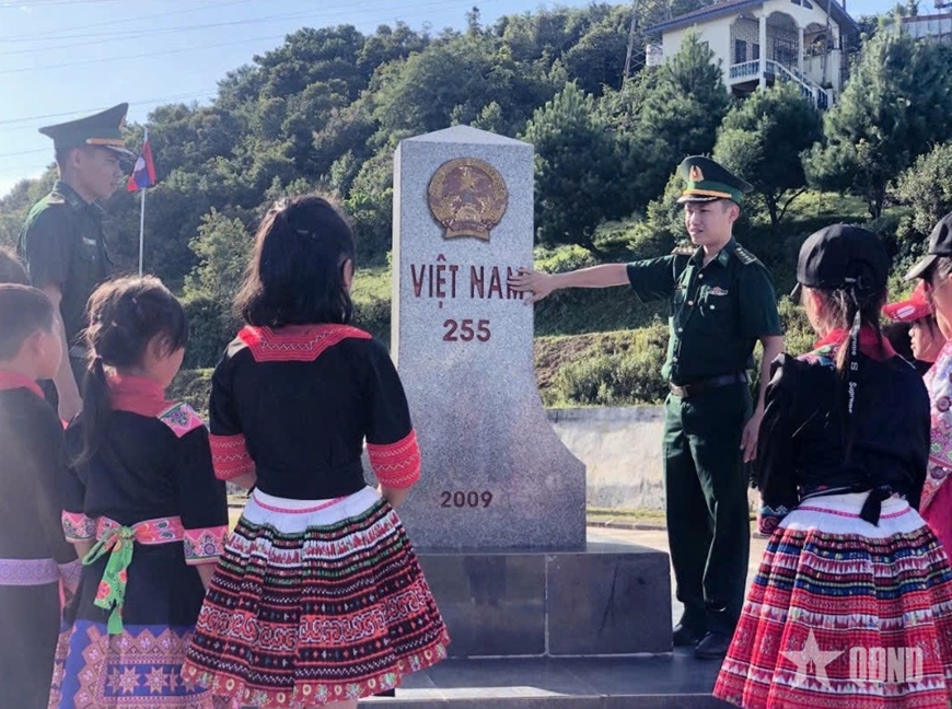 | Đồng chí Cầm Bá Thành (đứng bên phải) giới thiệu tại “Tiết học biên cương” trên cột mốc biên giới quốc gia. |