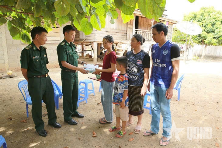 Thiếu tá Cầm Bá Thành trao kinh phí đỡ đầu trong Chương trình “Nâng bước em tới trường” hỗ trợ học sinh nước bạn Lào.