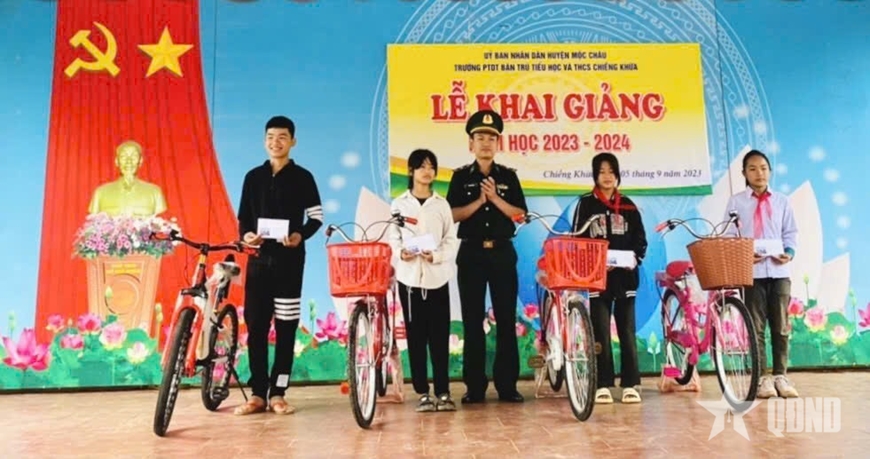 Thiếu tá Cầm Bá Thành trao học bổng và xe đạp tặng các học sinh được đỡ đầu trong mô hình “Ươm mầm xanh biên giới - Vững bước tới tương lai”.