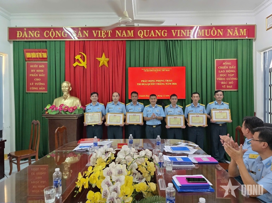 | Đại tá Thái Ngô Hưng, Chủ nhiệm khoa QSTT (đứng giữa) trao Giấy khen tặng các cá nhân trong Phong trào Thi đua Quyết thắng. |