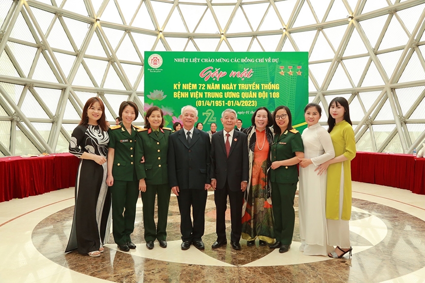 Thầy Nguyễn Quang Vinh (thứ 4 từ trái sang) trong buổi gặp mặt kỷ niệm 72 năm Ngày truyền thống Bệnh viện Trung ương Quân đội 108 (ngày 1-4-2023).