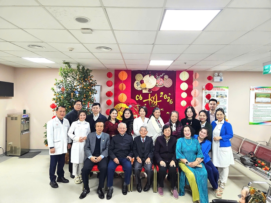 | Thầy Nguyễn Quang Vinh (thứ hai hàng ngồi từ bên trái sang) dự buổi gặp mặt, chúc Tết cán bộ, nhân viên các thời kỳ nhân dịp Tết Nguyên đán Bính Ngọ 2026. |
