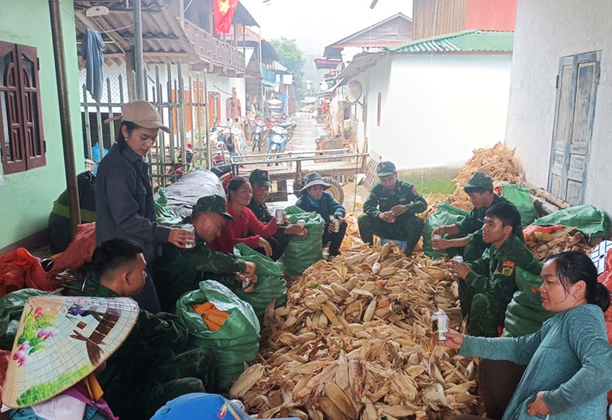| Cán bộ, chiến sĩ Đồn Biên phòng Pa Thơm cùng nhân dân địa phương giúp gia đình chị Lò Thị Thơm bóc vỏ ngô sau thu hoạch. |