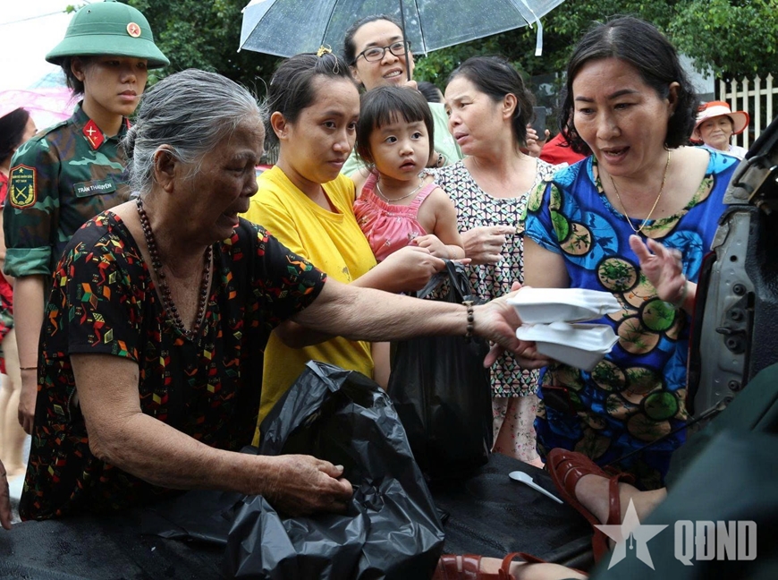 Trong những ngày “sống chung với nước lũ”, bao gia đình cầm cự bằng mì gói, mì tôm, những thanh lương khô bộ đội kịp thời mang đến. Gian bếp quen thuộc bị nhấn chìm trong lớp nước đục ngầu, lạnh ngắt; bếp lửa tắt từ ngày nước lên, nồi niêu nổi lềnh bềnh rồi chìm trong bùn. Khi dòng nước bắt đầu rút, bùn đất bám chặt từng dụng cụ, muốn nấu nồi cơm trắng cũng thành điều khó. Thấu hiểu điều ấy, Bộ CHQS các tỉnh và các đơn vị Quân khu 5 đứng chân trên địa bàn đã tổ chức nấu hàng nghìn suất cơm nóng hổi, mang đến tận tay nhân dân. Những hộp cơm giản dị mà ấm nghĩa tình, giữa bộn bề thiên tai, trở thành nguồn động viên kịp thời đối với bà con.