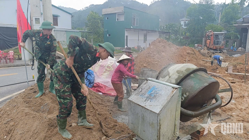 Ngày thứ Bảy, mặc cho tiết trời ở xã Khe Tre mưa rả rích, nhưng từ sáng sớm, gần 100 cán bộ, chiến sĩ các cơ quan, đơn vị thuộc Bộ CHQS thành phố Huế đã có mặt tại các khu vực sạt lở gia cố bờ kè, giúp các gia đình xây dựng, sửa chữa những căn nhà bị sập đổ, hư hỏng sau đợt mưa lũ hồi tháng 10 vừa qua. Những chiến sĩ tuổi mười tám, đôi mươi, không quản vất vả tích cực cùng các lực lượng và người dân đào móng, san nền, buộc sắt thép, đổ bê tông… xây dựng lại nhà ở giúp các gia đình bị sập đổ; tu sửa những ngôi nhà xiêu vẹo, đổ sập sau lũ; gia cố những khu vực có nguy cơ sạt lở.