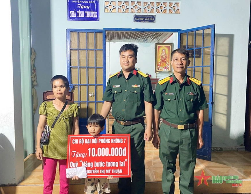 | Cán bộ Đại đội 7 (Ban CHQS huyện Côn Đảo) hỗ trợ kinh phí “Nâng bước tương lai” cho học sinh nghèo tại địa phương. |
