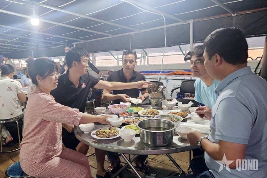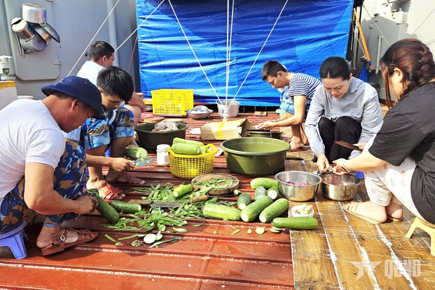 Ngày nào cũng vậy, ngày biển lặng cũng như hôm sóng dữ, cứ 4 giờ sáng là căn phòng dã chiến trên boong tàu của tổ phục vụ hơn chục người đã sáng đèn. Mỗi người một việc, người đứng bếp, người nhặt rau, người chuẩn bị bàn ghế để phục vụ các thực khách bữa sáng.