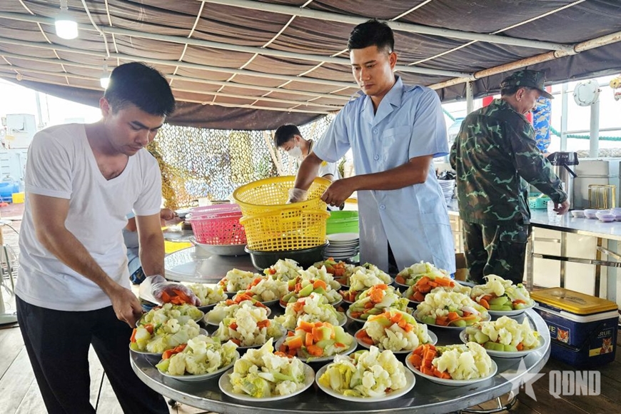 Thiếu tá QNCN Trần Ngọc Dũng chia sẻ: “Nếu chỉ phân công theo sở trường thì rất đơn giản. Nhưng chúng tôi cũng phải tính toán cả tình huống thời tiết xấu, khi biển động, việc đun nấu lại còn phụ thuộc rất nhiều vào sức khỏe, kinh nghiệm đi biển. Bởi những người sức khỏe không tốt, kinh nghiệm đi tàu ít, mà đứng bếp nấu chính trong bối cảnh biển động, tàu rung lắc là vô cùng khó khăn...”.