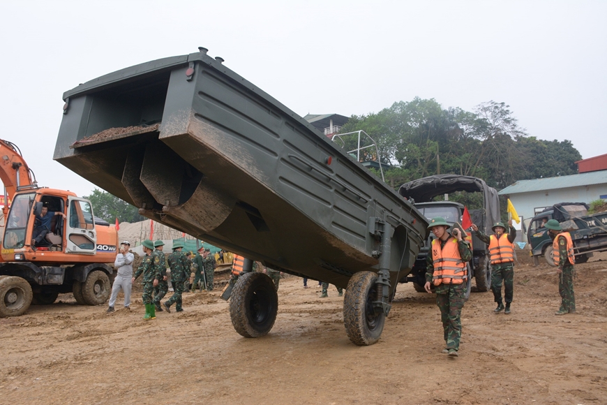 | Trời đã nhá nhem tối nhưng công việc của cán bộ, chiến sĩ Lữ đoàn Công binh 249 và các lực lượng vẫn diễn ra hối hả. |