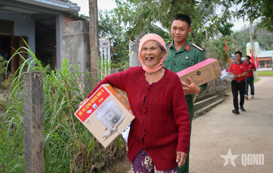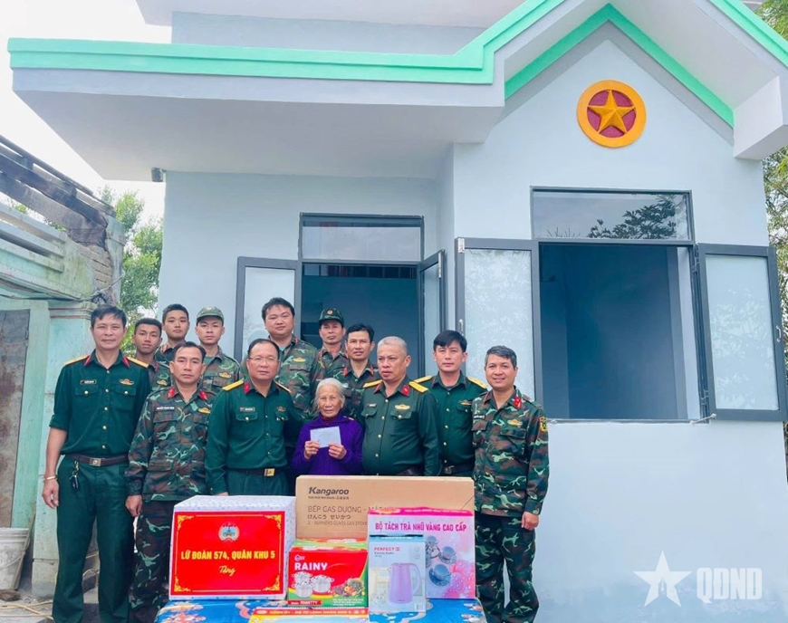 | Lữ đoàn Tăng thiết giáp 574 (Quân khu 5) trao quà tặng gia đình bà Nguyễn Thị Trao (thôn Phú Hữu, xã Hòa Thịnh, tỉnh Đắk Lắk) trong ngày về nhà mới. |