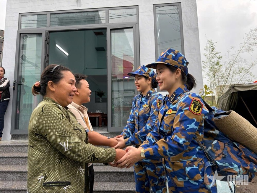 | Người dân xã Tuy Phước Đông (Gia Lai) chia tay cán bộ, nhân viên Bộ tư lệnh Vùng 3 Hải quân sau khi hoàn thành nhiệm vụ giúp dân xây nhà. |