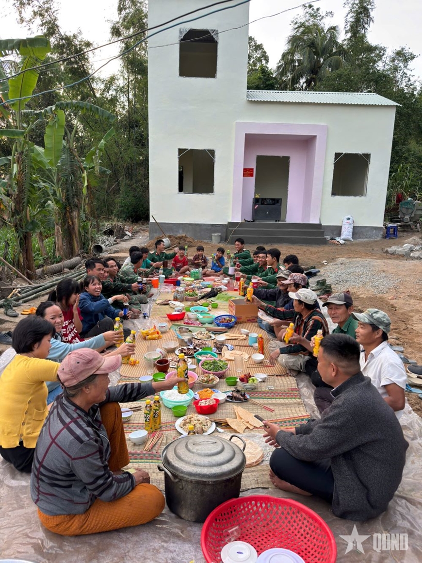| Bộ đội chung vui cùng gia đình được xây nhà mới. |