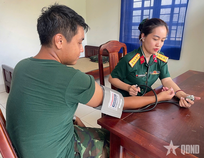 | Đại úy QNCN Ngô Huyền Anh Thư kiểm tra sức khỏe cho bộ đội. |