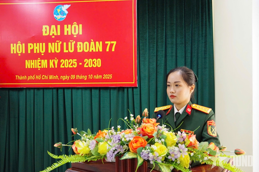 | Đại úy QNCN Ngô Huyền Anh Thư phát biểu tham luận tại Đại hội Hội Phụ nữ Lữ đoàn 77 nhiệm kỳ 2025-2030. |