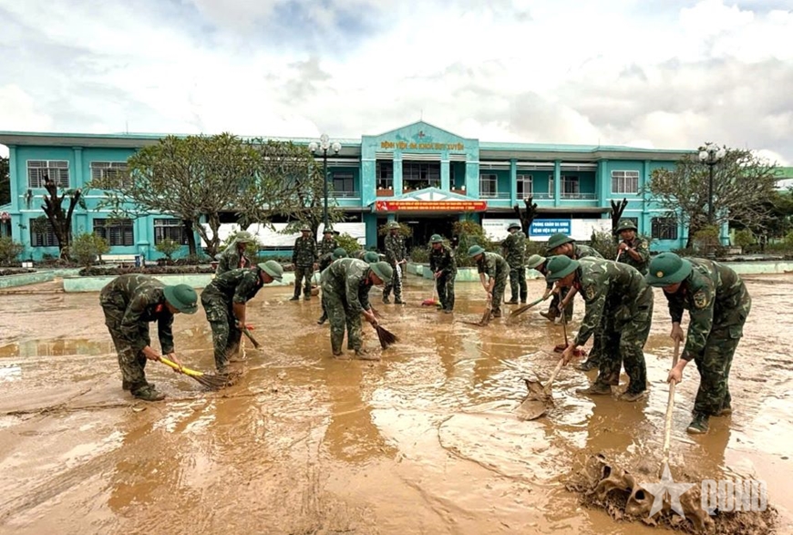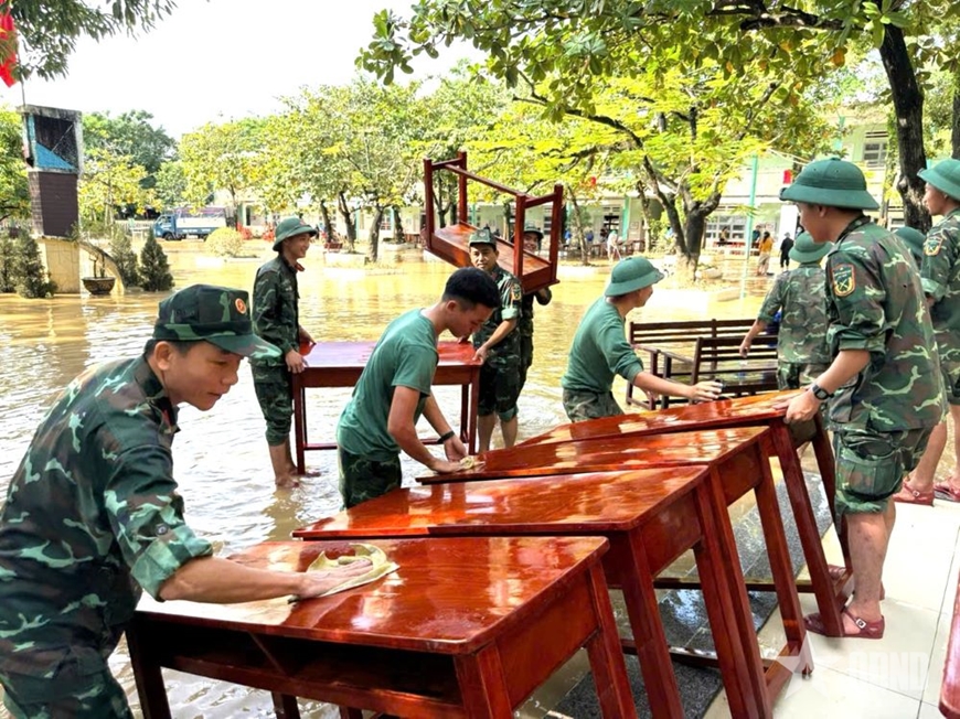 Từ khi nước lũ tràn về, lịch báo thức của các đơn vị: Trường Quân sự Quân khu 5, Tiểu đoàn Trinh sát 32, Tiểu đoàn Đặc công 409 (Bộ Tham mưu Quân khu 5) và Ban chỉ huy Phòng thủ khu vực 1-Cẩm Lệ, Trung đoàn 971 (Bộ CHQS TP Đà Nẵng) được chỉ huy đơn vị điều chỉnh sớm hơn bình thường 30 phút để bộ đội có thêm thời gian cơ động, giúp dân. Sáng sớm 31-10, sau khi lót dạ với bánh mì, bánh bao, bộ đội nhanh chóng tỏa về các xã, phường: Hòa Tiến, Hòa Vang, Hòa Khánh, Bà Nà, Điện Bàn Tây, Ngũ Hành Sơn... chung tay cùng các thầy cô giáo thu gom bùn đất, tổng dọn vệ sinh, sửa chữa bàn ghế, đồ dùng học tập, sẵn sàng đón các em học sinh trở lại trường.