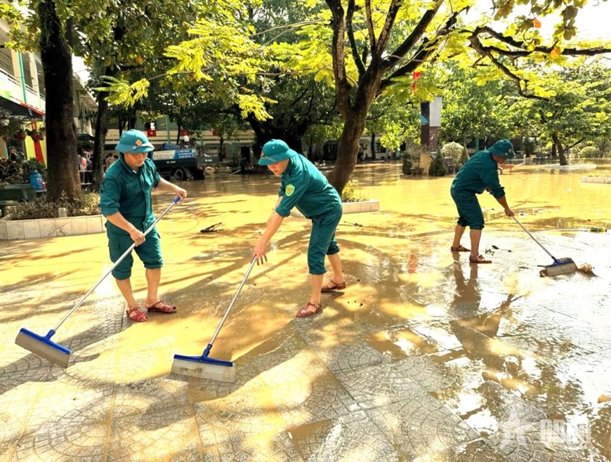 Trên sân Trường THCS Trần Quốc Tuấn (Hòa Vang, Đà Nẵng), nước đã rút nhiều song vẫn còn ngập quá đầu gối. Sau gần 4 giờ làm việc tất bật, khẩn trương, bộ đội đã thu gom được gần 200m3 bùn đất, quét dọn, vệ sinh sạch sẽ toàn bộ 26 phòng học, phòng sinh hoạt và khu vực nhà ăn, nhà bếp, sân chơi ở tầng 1. Những bộ bàn ghế, tủ hồ sơ, tài liệu được các thầy cô đưa lên tầng 2, tầng 3 để tránh lũ từ cuối tuần trước cũng được các chiến sĩ khiêng xuống, xếp đặt gọn gàng như lúc ban đầu.