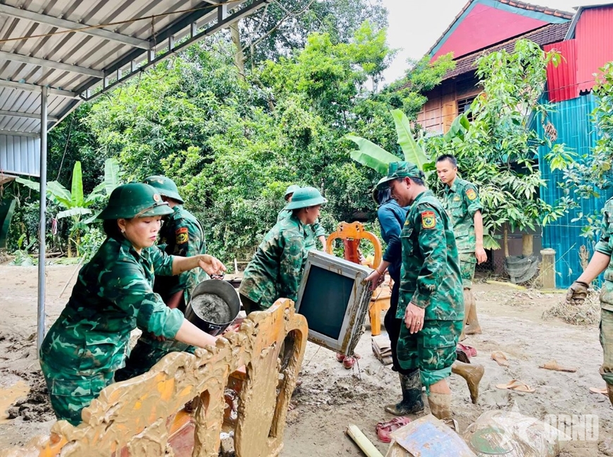 Hội viên phụ nữ Ban chỉ huy Bộ đội Biên phòng tỉnh Nghệ An tham gia hỗ trợ nhân dân địa phương khắc phục hậu quả mưa lũ. |