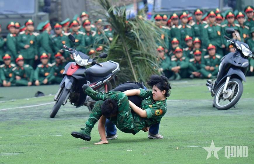Hội viên phụ nữ Ban chỉ huy Bộ đội Biên phòng tỉnh Nghệ An trong một tình huống luyện tập đánh bắt tội phạm. |