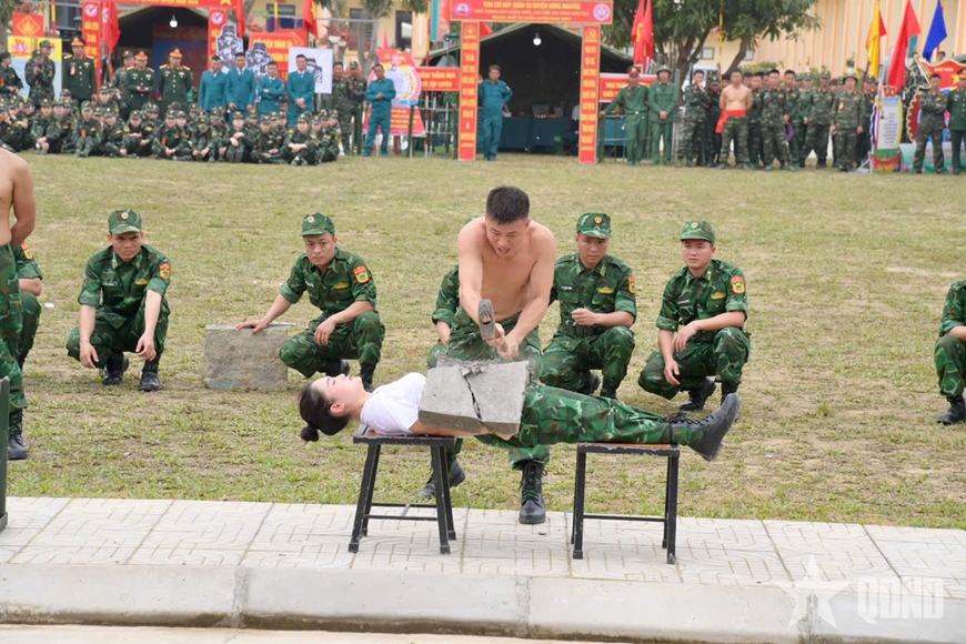 Hội viên phụ nữ Ban chỉ huy Bộ đội Biên phòng tỉnh Nghệ An biểu diễn khí công trong lễ ra quân huấn luyện năm 2025. |