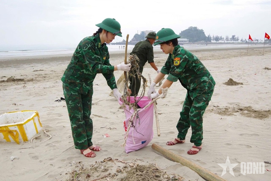 Hội viên phụ nữ Ban chỉ huy Bộ đội Biên phòng tỉnh Nghệ An tích cực tham gia chương trình “Hãy làm sạch biển”. |