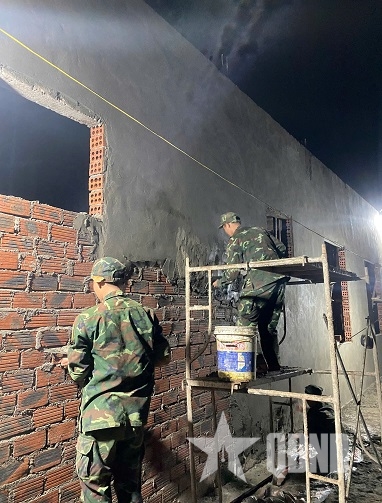 | Bộ đội Trung đoàn 19 (Sư đoàn 968) tranh thủ thời gian ban đêm hoàn thiện nhà ở cho người dân xã Khe Sanh, tỉnh Quảng Trị. |