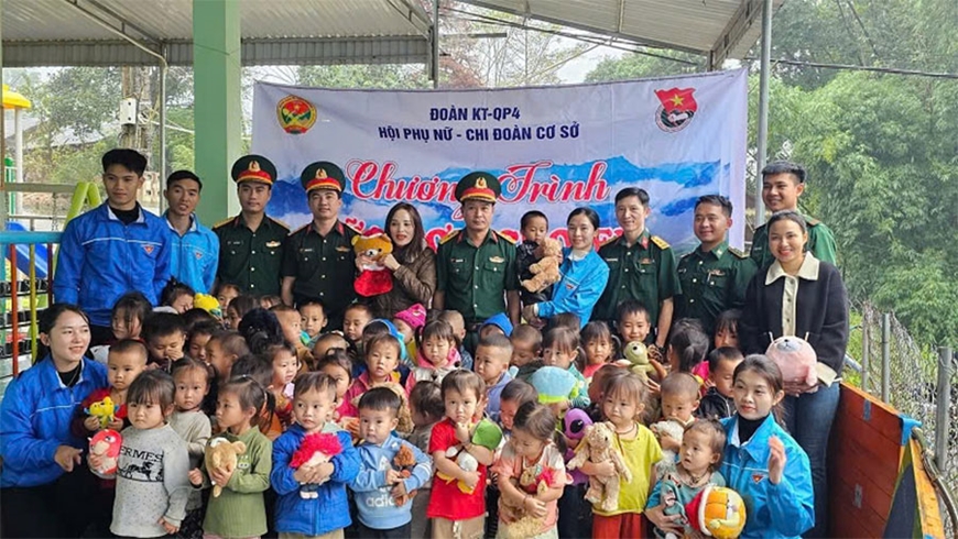 | Đoàn Kinh tế - Quốc phòng 4 tổ chức bữa cơm cho em, hỗ trợ học sinh Trường Mầm non Na Ngoi (Nghệ An). |