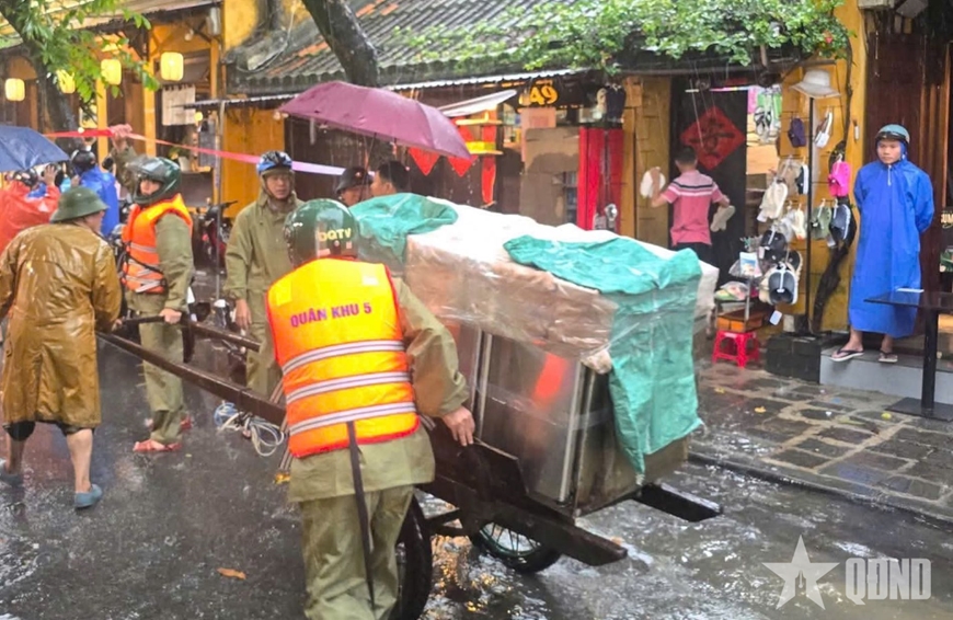 Cán bộ, chiến sĩ Ban Chỉ huy Phòng thủ khu vực 5 - Điện Bàn (Bộ CHQS TP Đà Nẵng) phối hợp với các lực lượng giúp nhân dân phường Hội An di chuyển tài sản, vật dụng đến nơi an toàn.