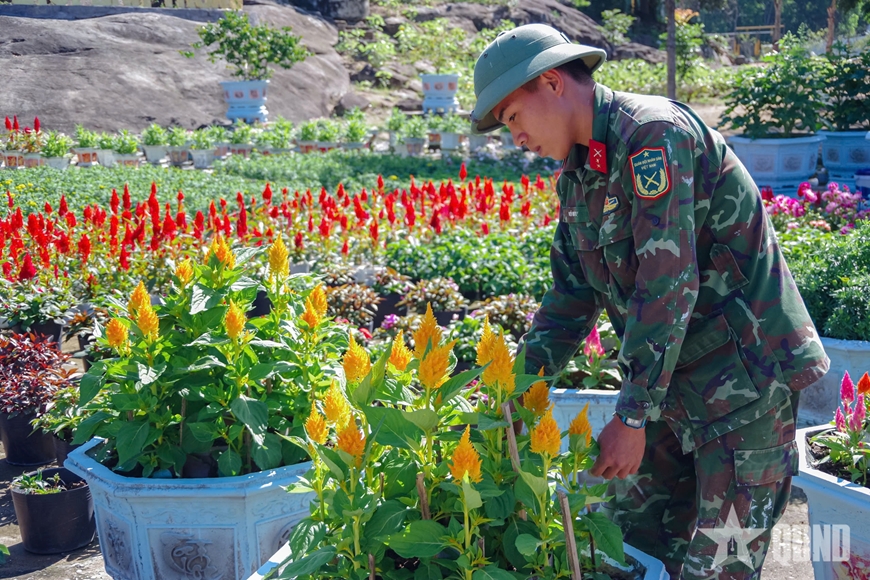 | Những chậu hoa đang vươn mình trong nắng mới, qua đôi bàn tay khéo léo của bộ đội càng thêm rực rỡ, không khí xuân về sớm hơn với đơn vị. |