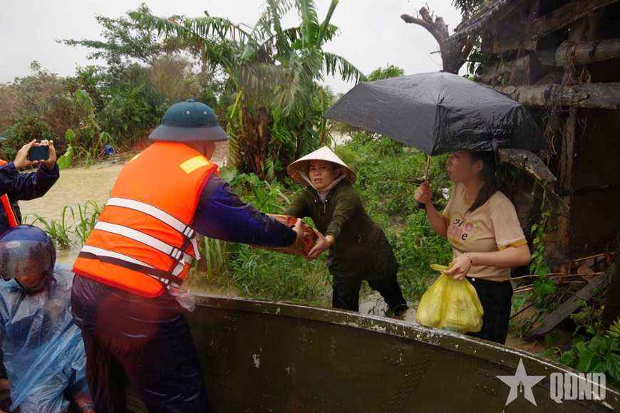 Tại các địa điểm ngập sâu, dù hàng hóa của các đoàn thiện nguyện tiếp tế cho bà con đã có, nhưng đến được với bà con lại là bài toán khó. Không quản vất vả, hiểm nguy, cán bộ, chiến sĩ Sư đoàn 2 chèo xuồng, thuyền, băng qua dòng nước để kịp thời đưa thực phẩm đến với bà con. Từng thùng mì tôm, nước uống, nhu yếu phẩm cần thiết đến tận từng hộ dân. Mỗi phần quà được gửi đi là tấm lòng của cán bộ, chiến sĩ Sư đoàn 2 gửi đến người dân bằng tinh thần trách nhiệm, tận tụy và đầy tình người.