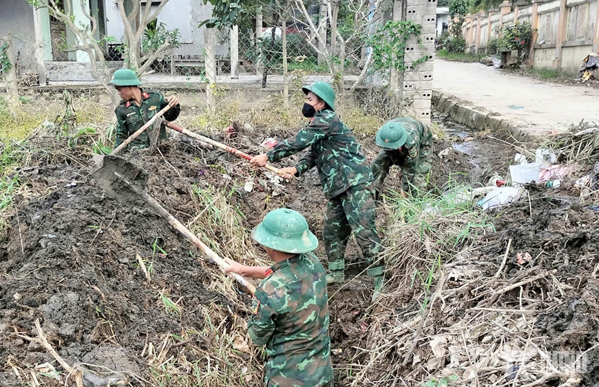 | Chiến sĩ Sư đoàn 2 khơi thông kênh mương, rãnh thoát nước. |