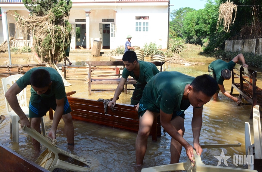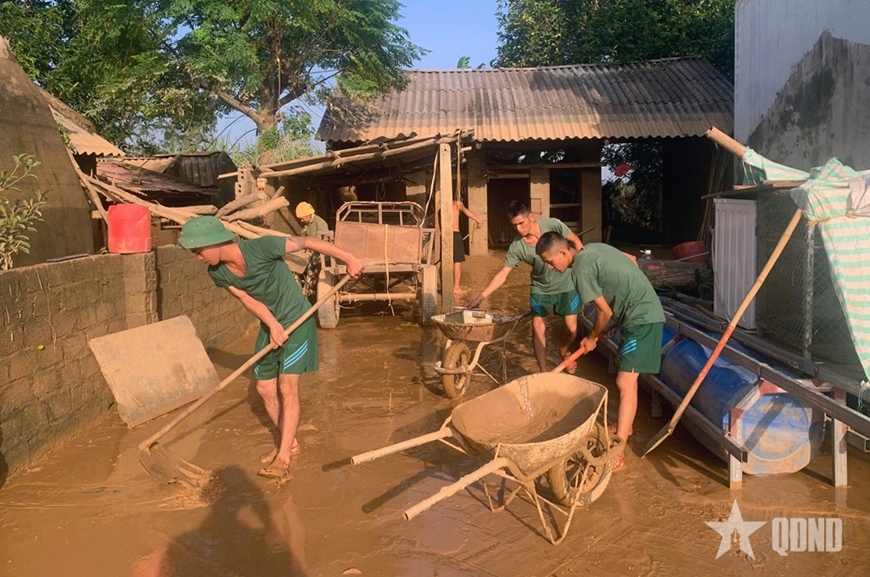 Gần 300 cán bộ, chiến sĩ Sư đoàn 390 đã tỏa đến gần 50 thôn, làng giúp nhân dân khắc phục hậu quả.