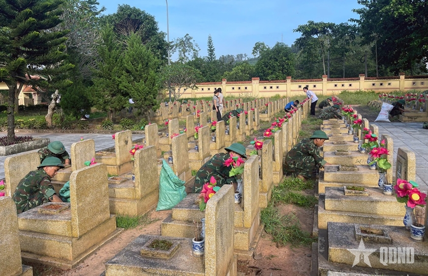 Cán bộ, chiến sĩ dọn dẹp vệ sinh nghĩa trang liệt sĩ. |