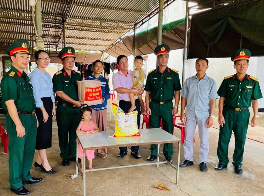 | Chỉ huy Sư đoàn 9 trao quà tặng gia đình có hoàn cảnh đặc biệt khó khăn. |